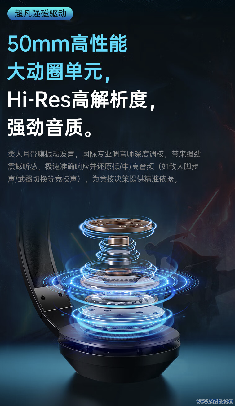 这款耳机配备50mm动圈单位,内置竞技级 C-Media 芯片及 360° 通话降噪麦克风,领有 7.1 定点锁位环绕音效,相沿自界说 EQ 雷同。